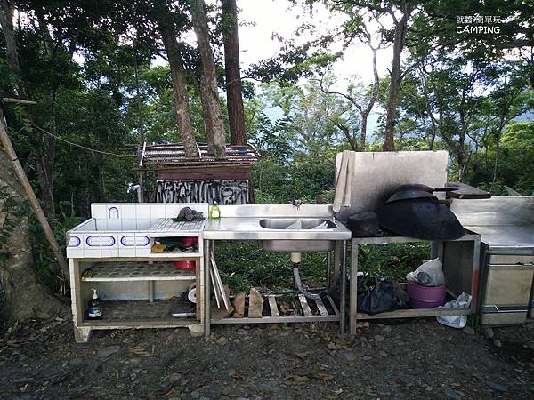 營地內,雖然洗手台不多,卻有一組廚房設備。前方還有多組的桌椅供露友使用。