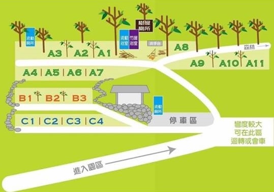 從營地的平面圖來看,下圖為營地左邊的A、B、C三區,A區位於上層,B、C區在下層。