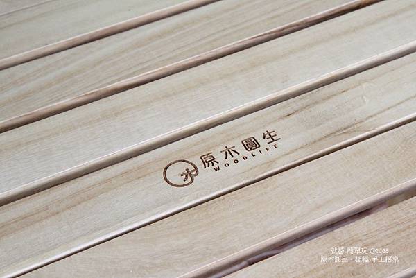 每塊木片在色澤、紋路上有天然的差異。桌面上燒烙著品牌logo和名稱很有質感。