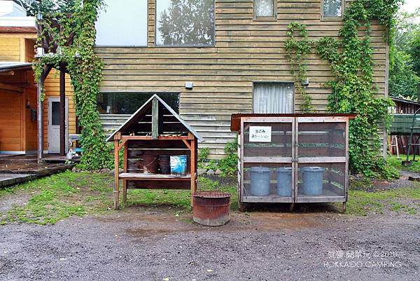 入口處的營本部,是一棟木造的矮房。右邊的鐵籠裡,供露友丟棄廚餘和炭火。