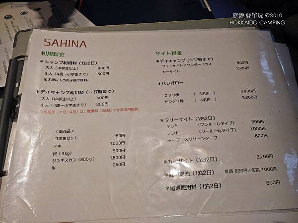 ニセコサヒナ露營場(Sahina露營場)營位的費用,依據所需加額計算,例如車是否停帳邊、是否用電都另外計算費用,同時也有提供帳篷的出租。