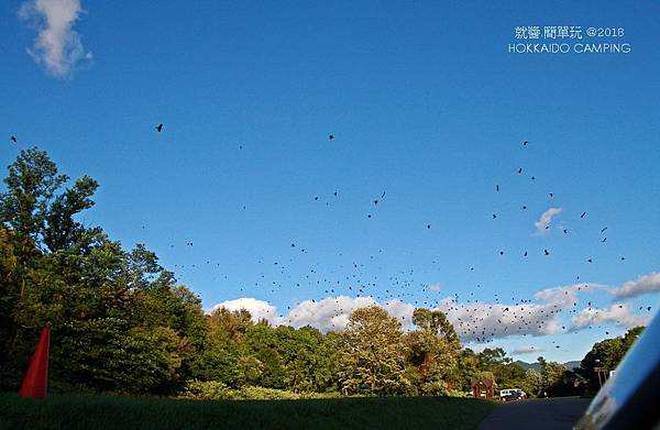 才剛抵達,森林裡瞬間傳來一陣騷動,眼前馬上布滿一片黑,滿滿的烏鴉傾巢而出,超特殊的景觀,看得我們驚訝聲連連。日本烏鴉真的氾濫到極致。