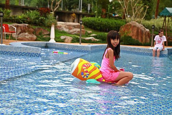 孩子吃飽飯,不得閒,彷彿忘了季節,馬上換了衣服跳入鳳梨池中。